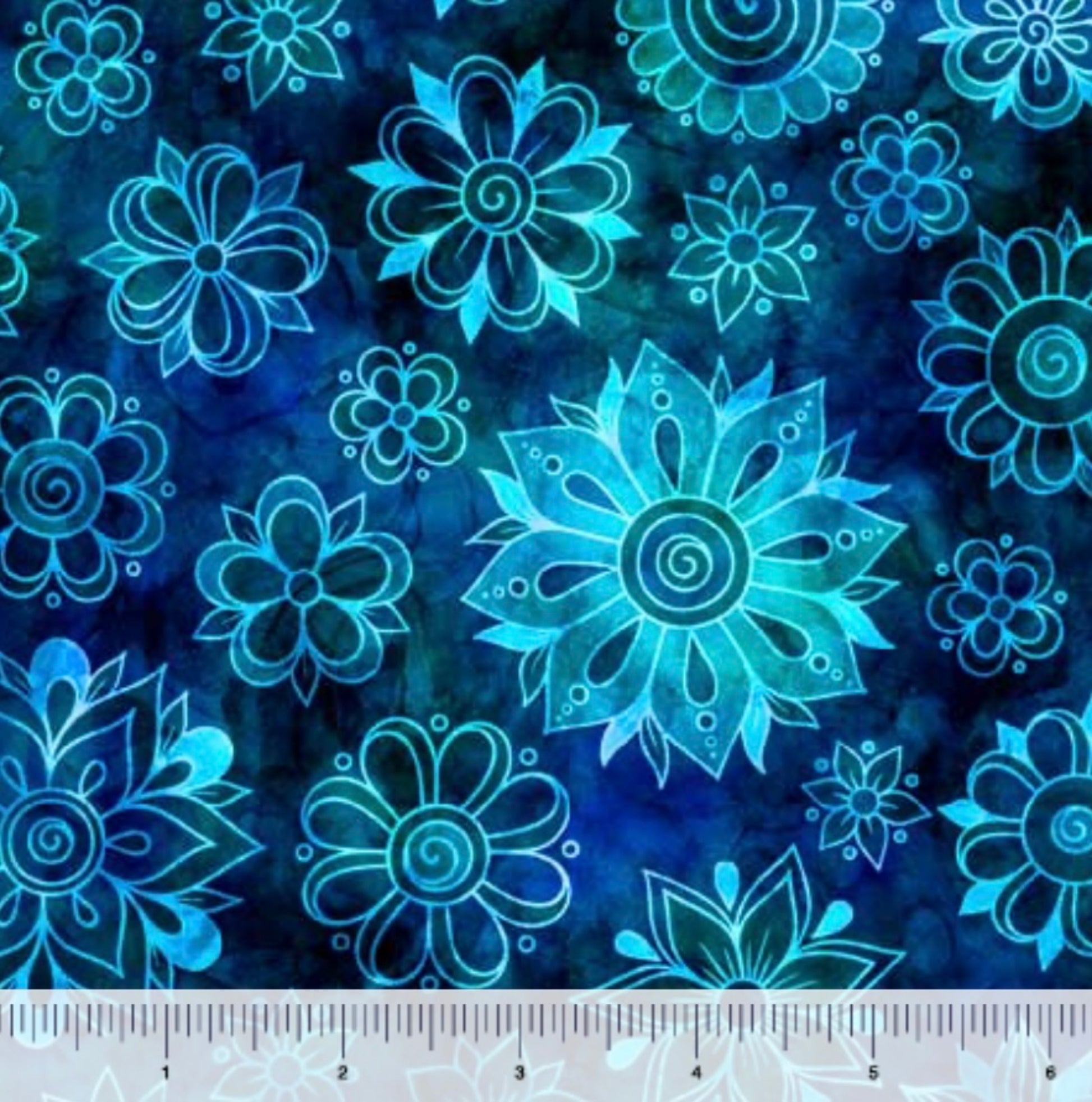 Bohemian Dreams - Floral Toss in Shades of Blue - 29019 - from the Bohemian Dreams Collection by Dan Morris for QT Fabrics.  Blue Geometric Floral Toss. This is 100% cotton fabric. Coordinates with our Bohemian Dreams Strips (Jelly Roll).