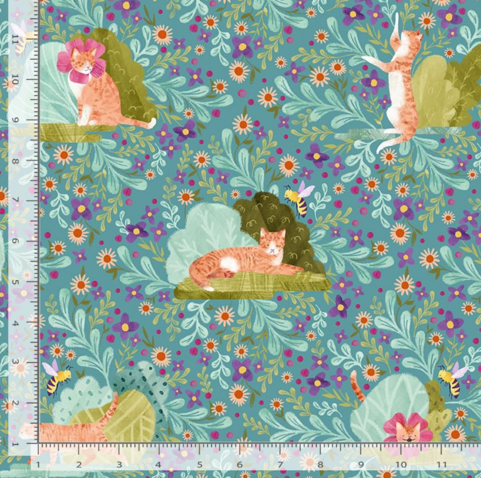 Curiosity Blooms Fabric  - from the Curious Garden Collection by Pammie Jane for Dear Stella Fabrics DPJ2703 - Cats and Bees adorn this fabric. Additional fabrics from the Curious Garden Collection are also available.