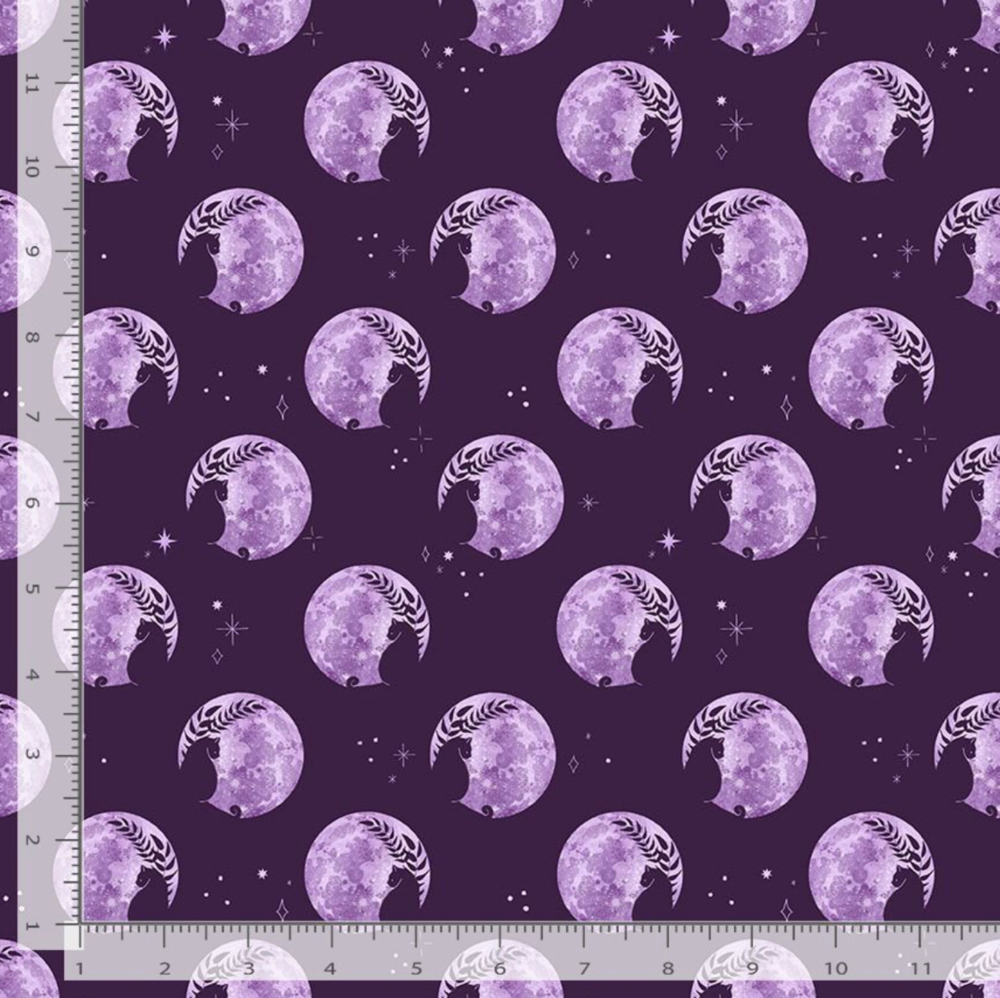 Enlightened - from the Phoebe Collection by Pammie Jane for Dear Stella Designs - DPJ2965 - PURPLE. Celestial Lavender Moons with Cat Silhouettes set against a dark purple background. 100% cotton, digitally printed.