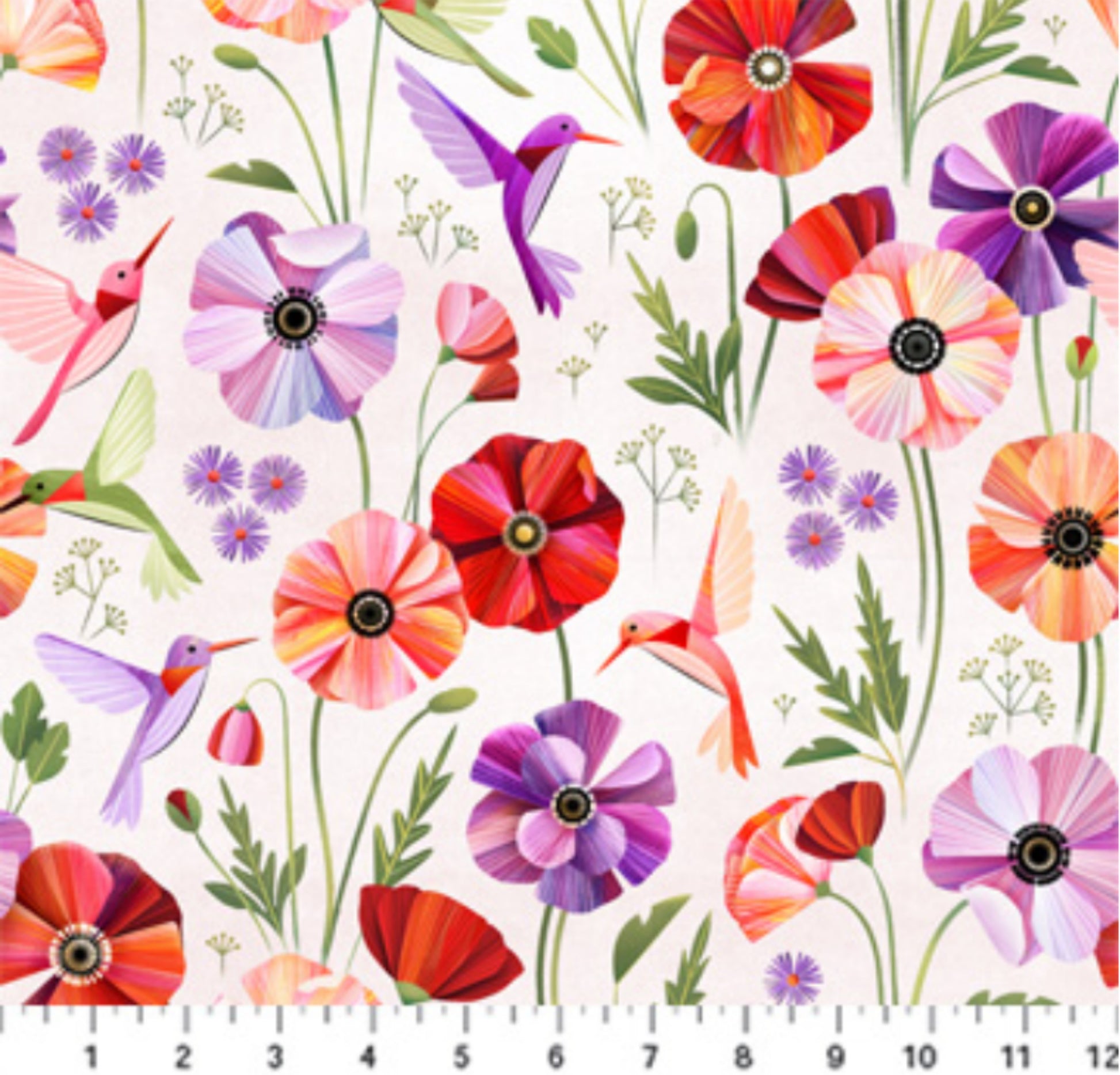 Poppy Field from the "Sunday" Collection by Laura Moyer for Figo Fabrics - D90629-10. Bright florals and hummingbirds on a white background. Digitally printed. This is 100% Cotton fabric, machine wash in cold on the gentle cycle. Use only non-chlorine bleach if needed, tumble dry on low heat if needed, and iron on "warm" if needed.