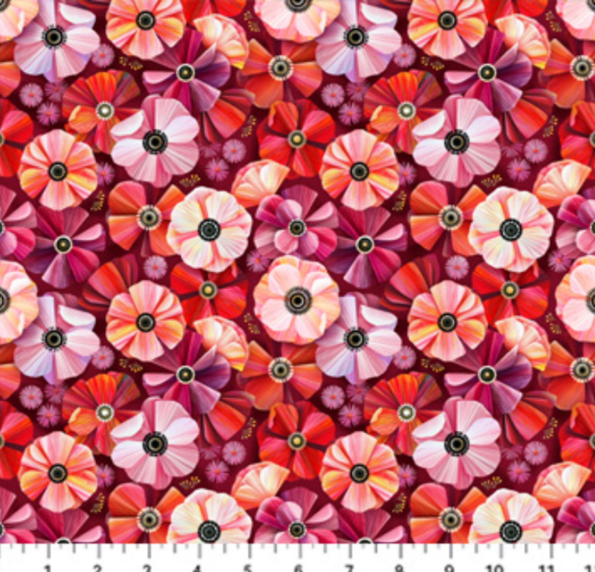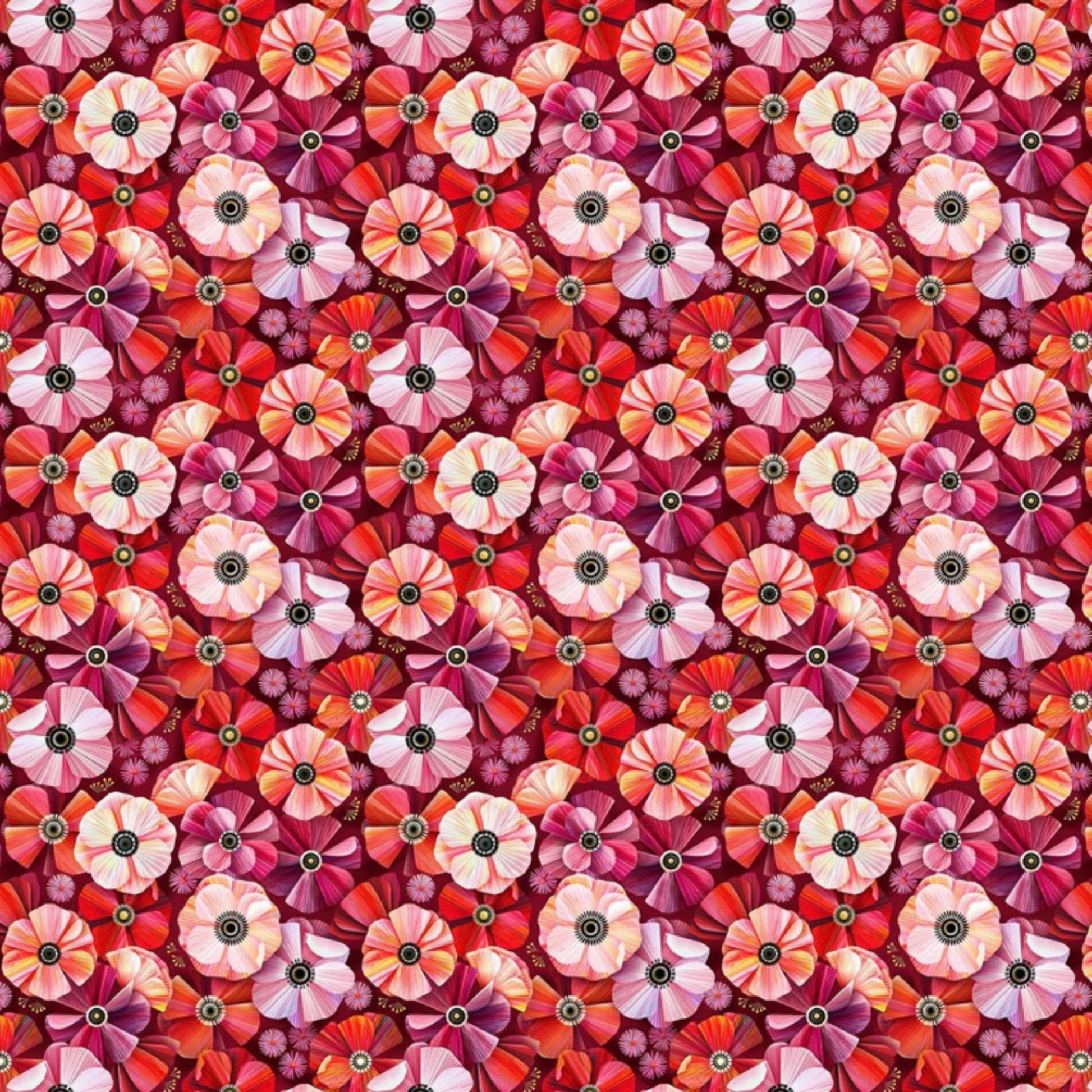 Poppy Head from the "Sunday" Collection by Laura Moyer for Figo Fabrics - D90630-10. Bright red floral poppies. Digitally printed. This is 100% Cotton fabric, machine wash in cold on the gentle cycle. Use only non-chlorine bleach if needed, tumble dry on low heat if needed, and iron on "warm" if needed.