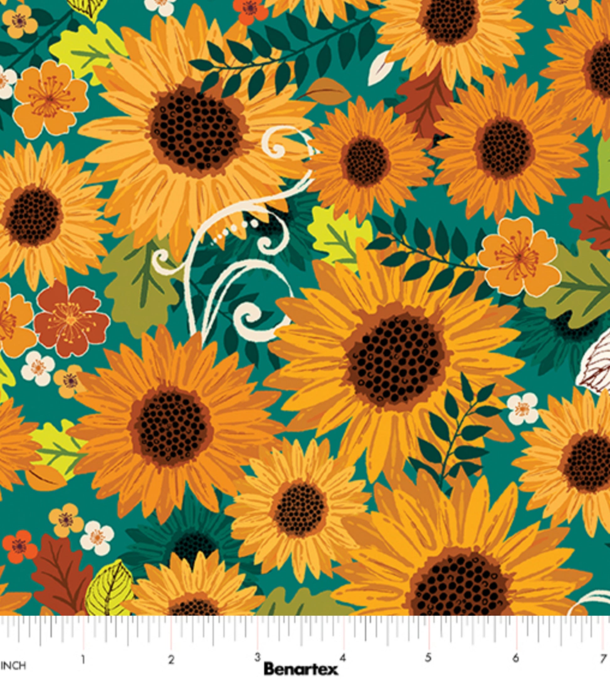 Harvest Sunshine - Teal - Gather Together Collection by Nicole DeCamp for Kanvas Fabrics - 1445984B. Bold Sunflowers against a teal background. 100% Cotton, digitally printed.