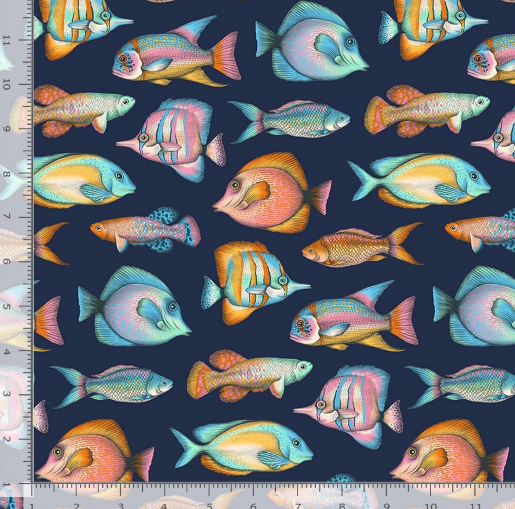 Off The Hook - Terrian of Thought Collection - D2900 Moonlight - Dear Stella Fabrics -  Rainbow Fish on a dark blue background. 100% cotton, digitally printed.