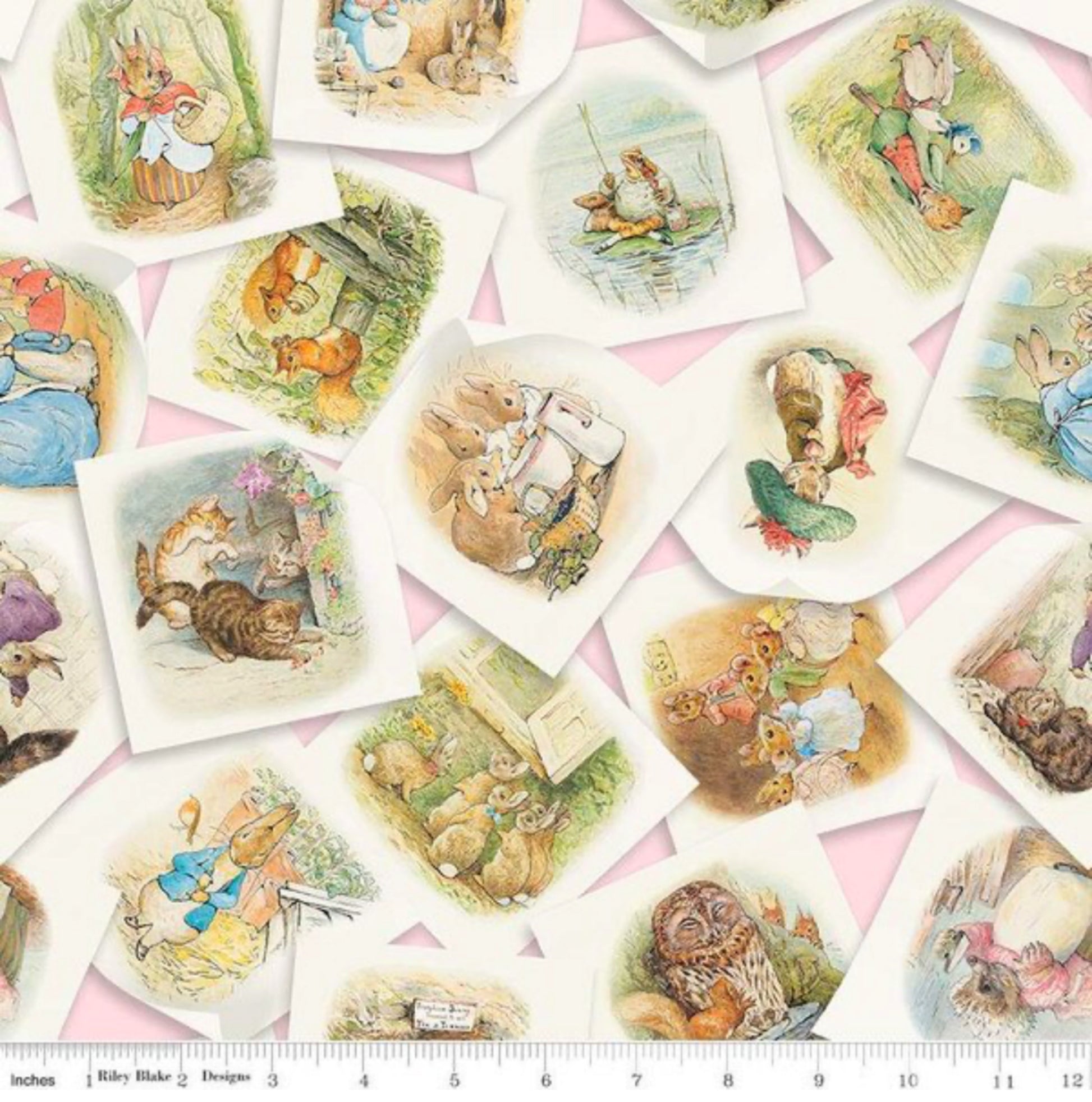Peter Rabbit and Friends™ - Main Fabric - Pink - Riley Blake Designs - CD15860-PINK.  Peter Rabbit and Friends Collection for Riley Blake Designs. Great for quilting, apparel and sewing. Featuring scenes and characters from Peter Rabbit. 100% Cotton, digitally printed.  Official licensed product. Beatrix Potter™  ©Frederick Warne & Co., 2023. All rights reserved.