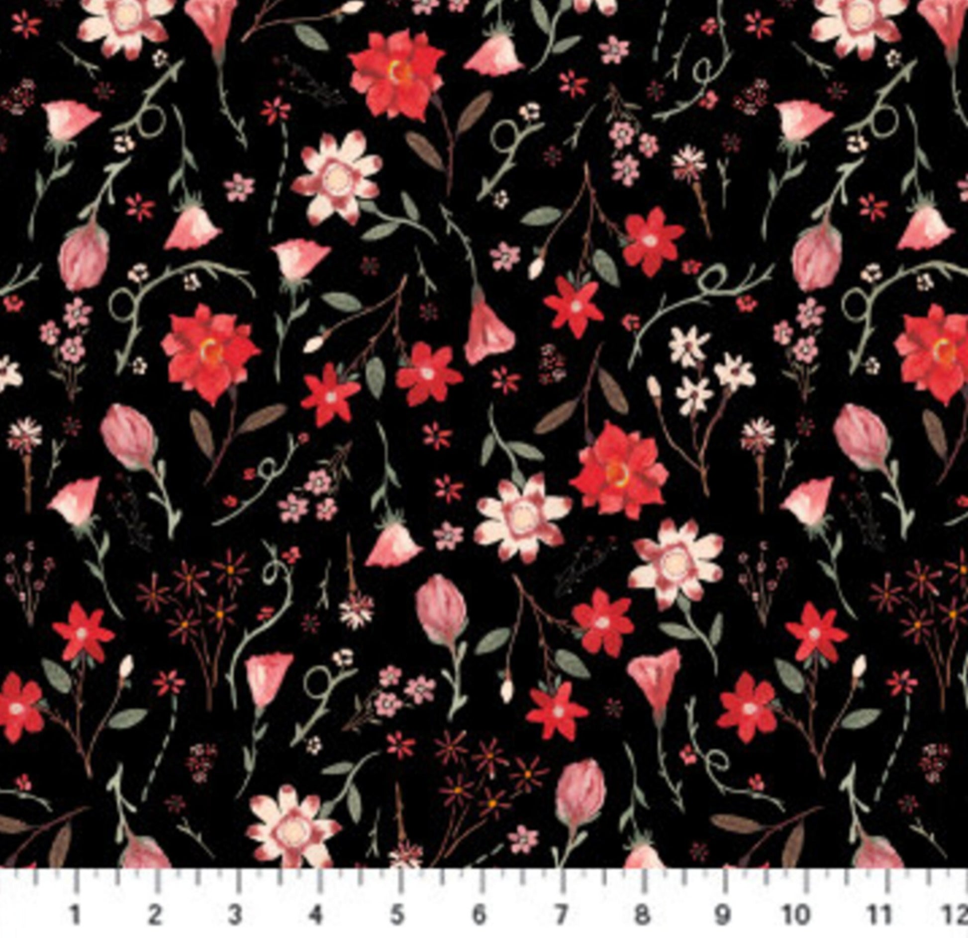 "Roses" from the Roses are Red Collection in Black for Figo Fabrics - 90486-99. Beautiful Roses scattered on a Black Background. This is 100% Cotton fabric, machine wash in cold on the gentle cycle. Use only non-chlorine bleach if needed, tumble dry on low heat if needed, and iron on "warm" if needed.