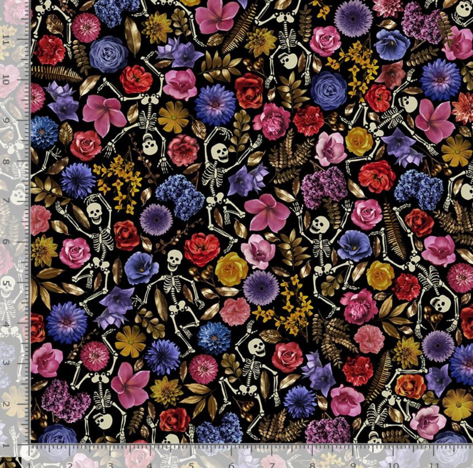 Skeleton Dancing - Apothecary Collection - Timeless Treasures Fabrics - FUN-CD2878 - Multi - Skeletons dancing around flowers on a black background. Great for Halloween projects or all year long. 100% cotton, digitally printed.