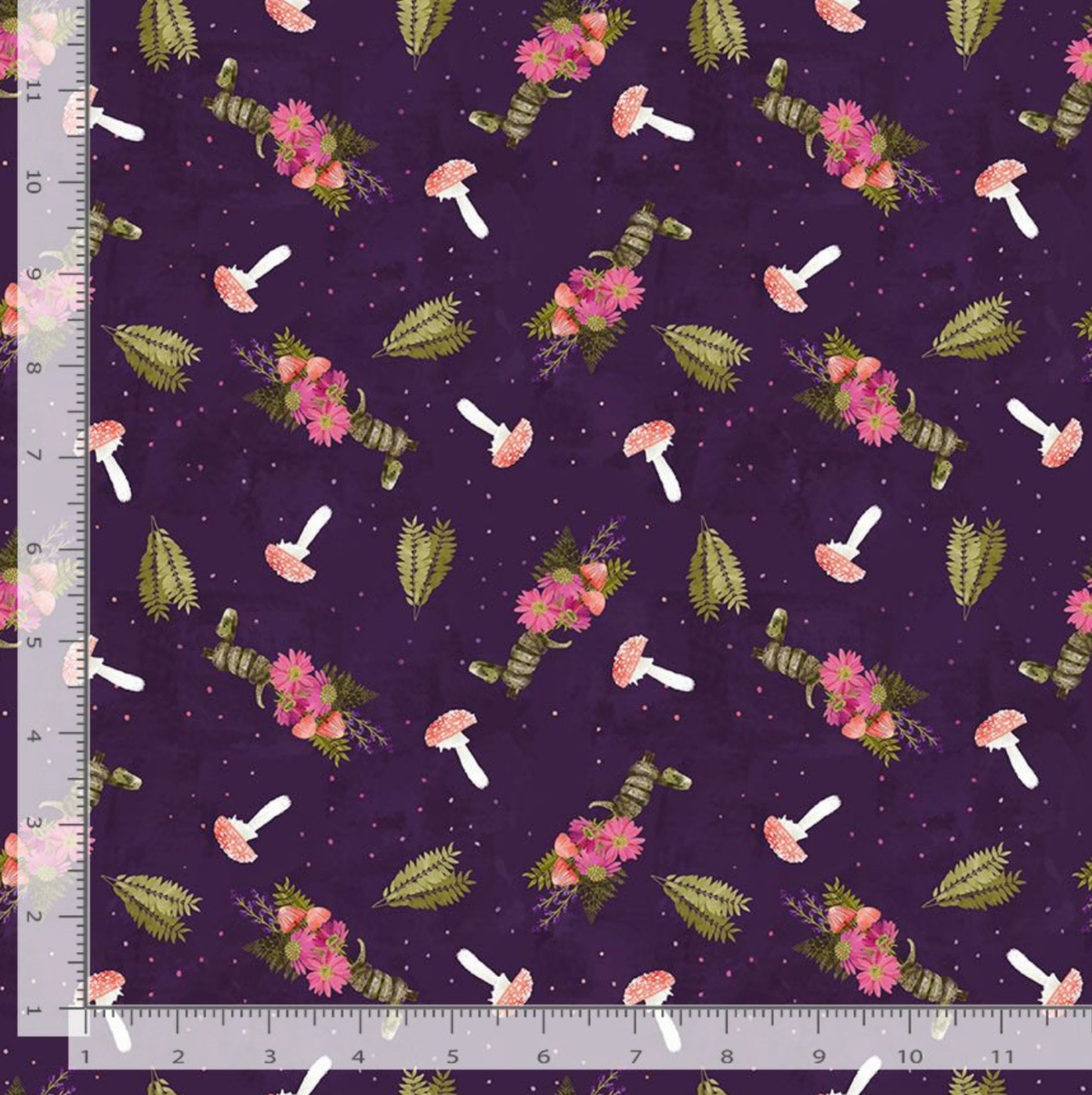 Snake Bouquet - from the Phoebe Collection by Pammie Jane for Dear Stella Designs - DPJ2971 - PURPLE.  Mushrooms, Snakes and Flora set against a dark purple background. 100% cotton, digitally printed.