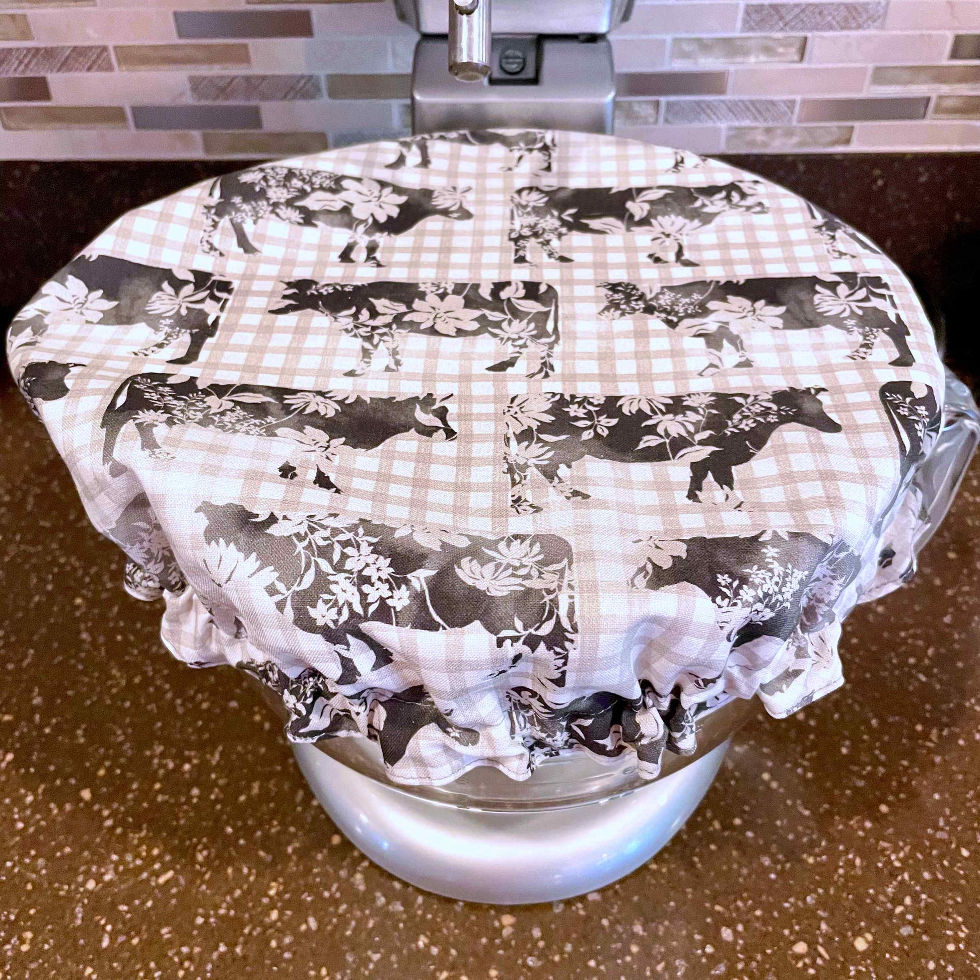 Our "Floral Cows"  XL Mixer Bowl Cover is great for your Farmhouse Decor Kitchen. Reversible Stand Mixer Bowl Covers are the perfect solution for keeping your Stand Mixer Bowl dust-free between use and allows you to store a few paddles in your bowl as well, unseen and ready for use. Our Bowl Covers can be used on any medium to large bowl or pie plate!