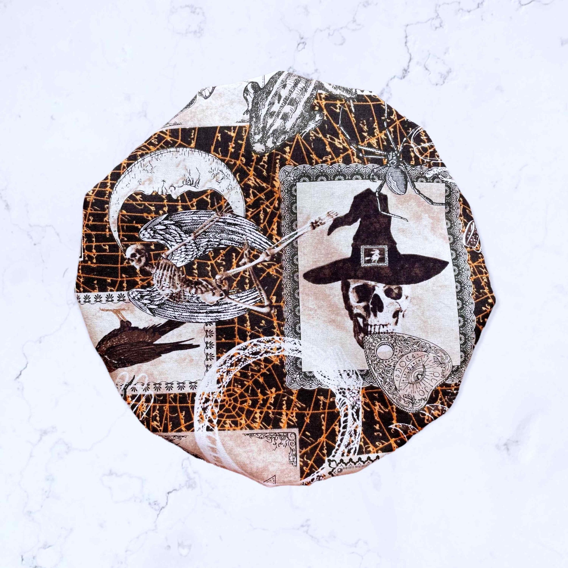 The Reversible Cotton Bowl Covers fit any 4.5 - 6 qt. standard mixer bowls. I received an Artisan mixer last year for Christmas, and it looks beautiful on my counter, but I remembered growing up my grandmother would sew her own bowl covers for her stand mixer and I decided it was just what I needed for mine. This Mixer Bowl Cover features our Gothic Theme Fabric featuring Bats, Moons, Ouija Boards, Spiders and More! Don't forget to order your matching Stand Mixer Slider Mat in this fabric, sold separately.