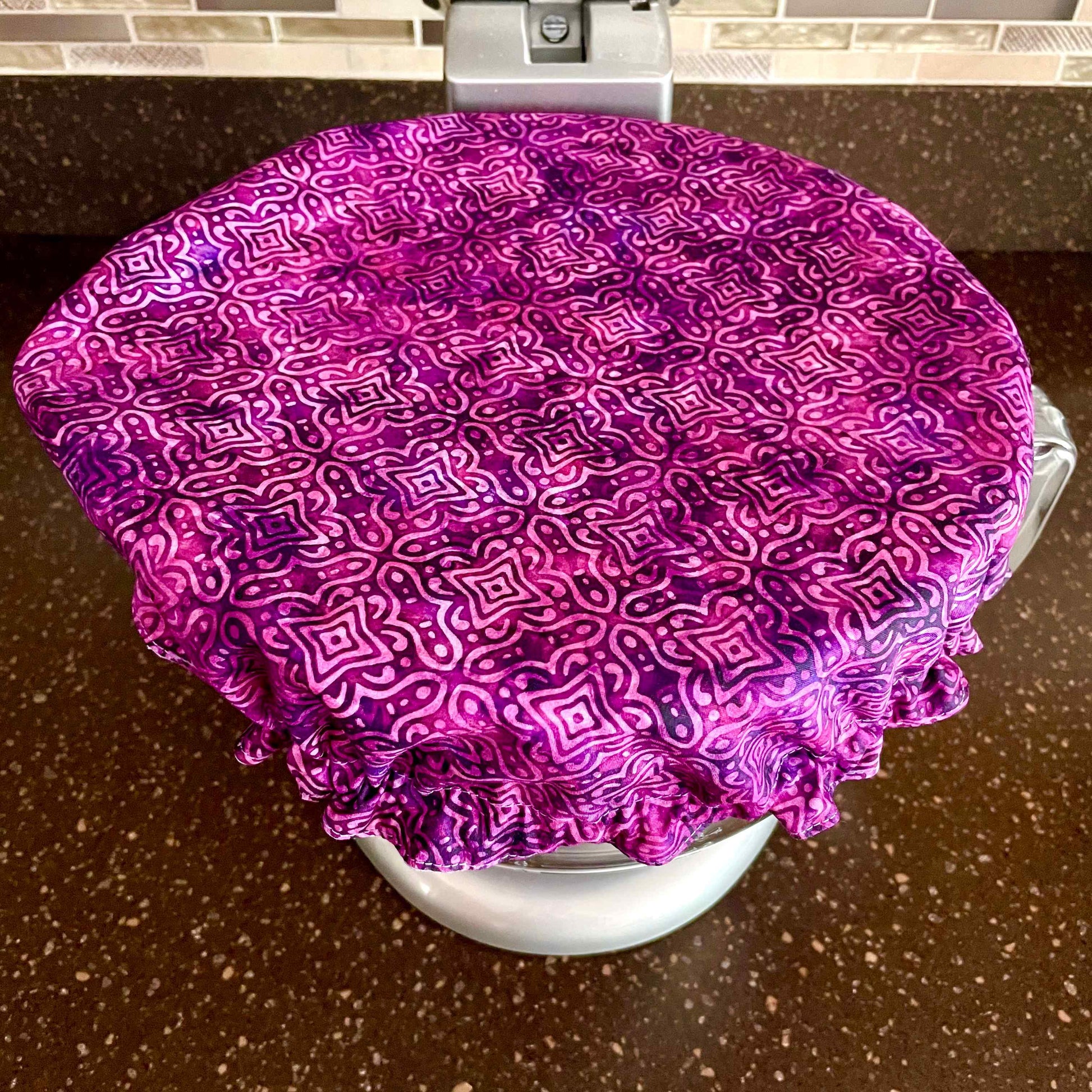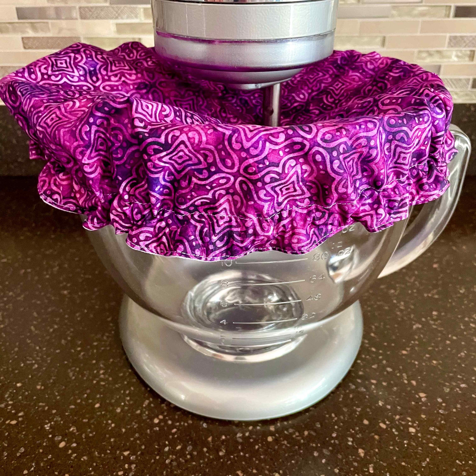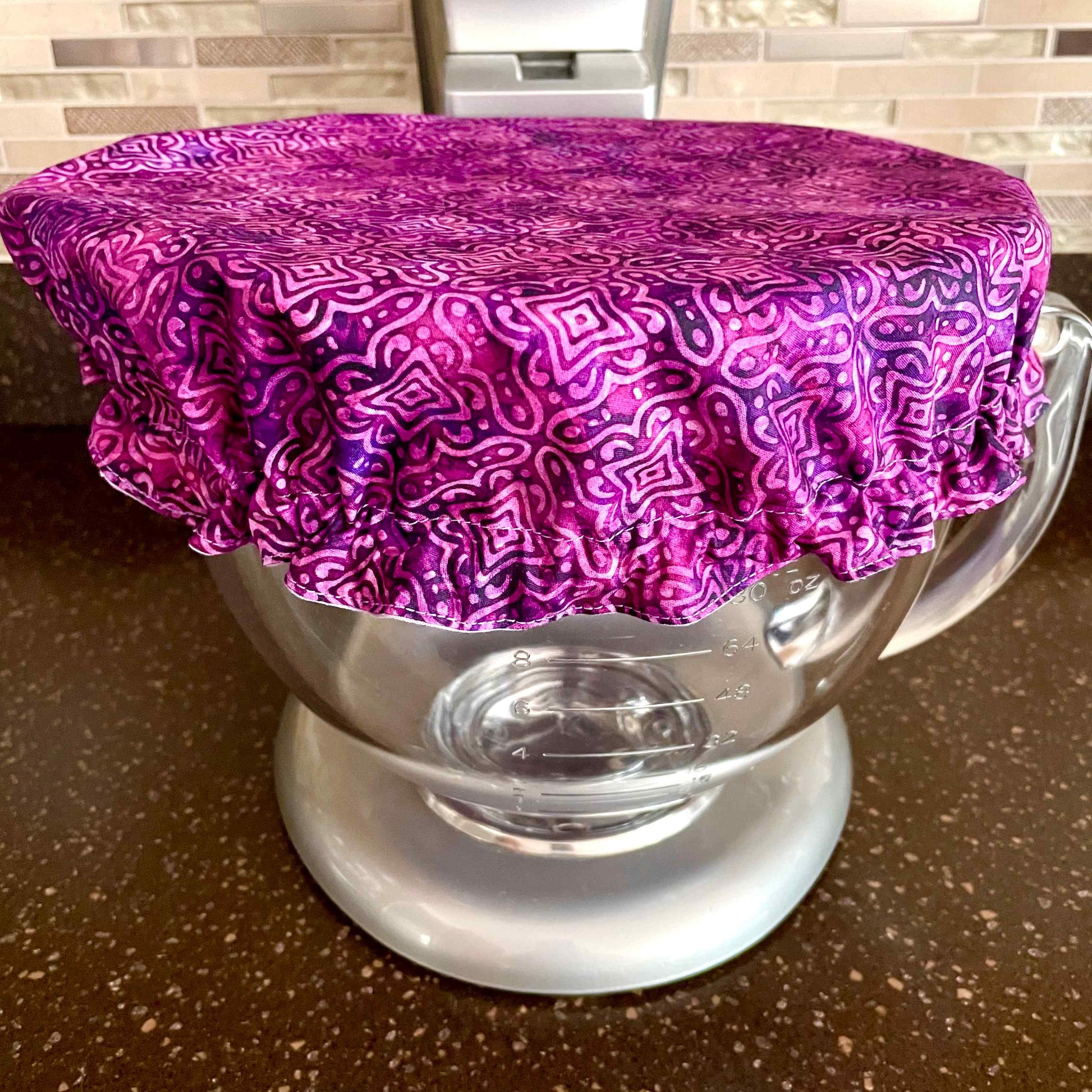 The Reversible Cotton Bowl Covers fit any 4.5 - 6 qt. standard mixer bowls. I received my KitchenAid mixer as a gift last year. It looks nice on my counter, but it's gorgeous with the bowl cover on. This Stand Mixer Bowl Cover features our "Purple Batik" fabric. Mixers and any props in the picture are not included. I also have this available in Fabric By The Yard for your own projects!