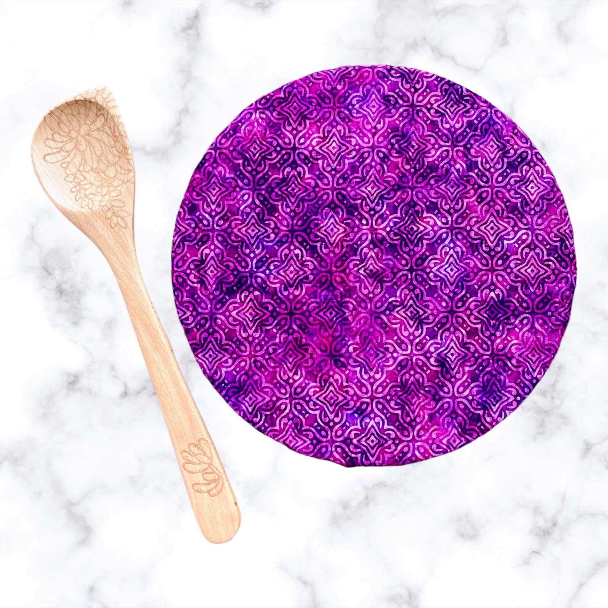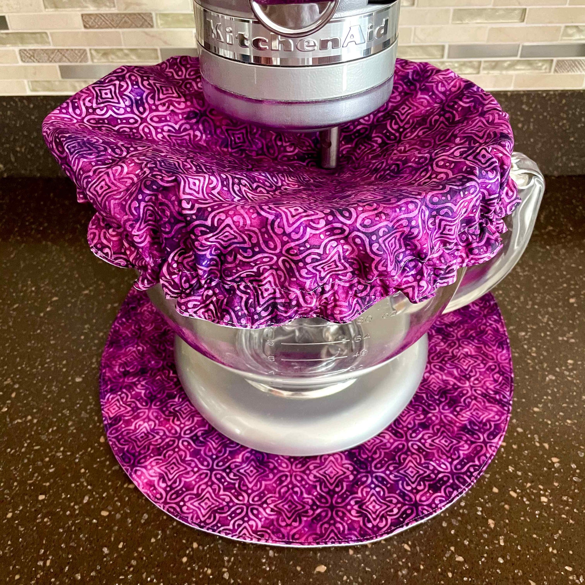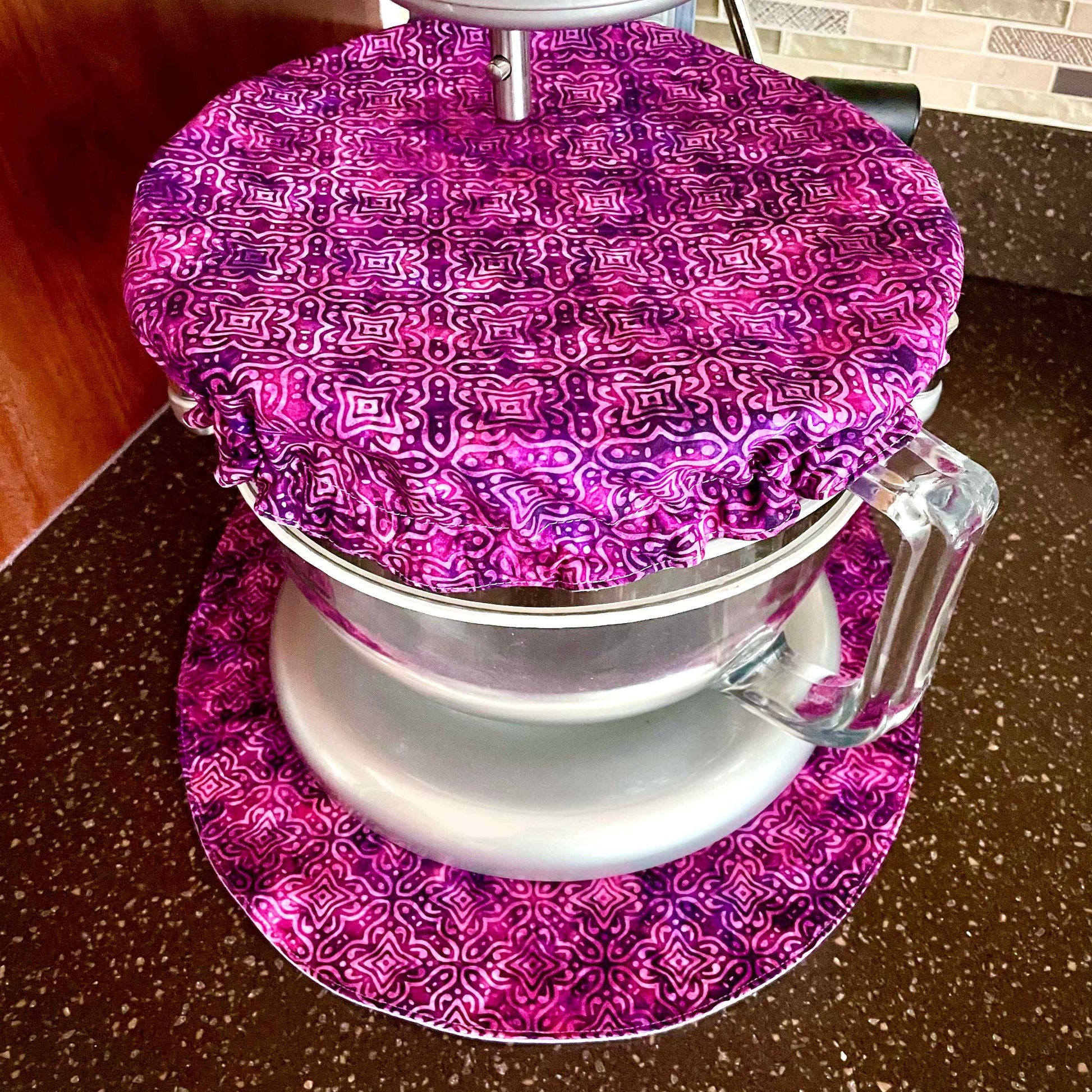 The Reversible Cotton Bowl Covers fit any 4.5 - 6 qt. standard mixer bowls. I received my KitchenAid mixer as a gift last year. It looks nice on my counter, but it's gorgeous with the bowl cover on. This Stand Mixer Bowl Cover features our "Purple Batik" fabric. Mixers and any props in the picture are not included. I also have this available in Fabric By The Yard for your own projects!