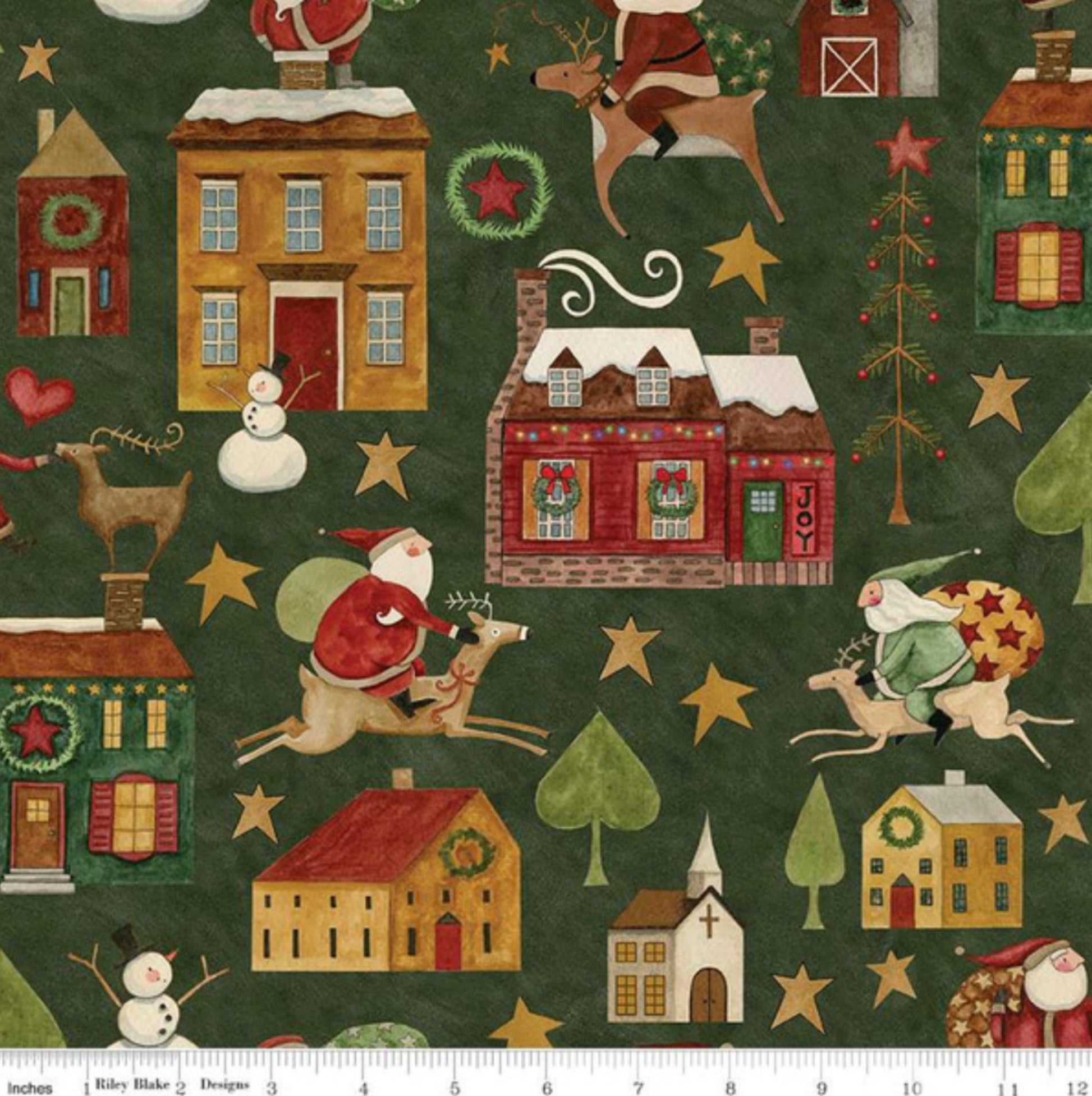 Up On The Housetop - Main Fabric - Green - by Teresa Kogut for Riley Blake Designs - C14730 - Featuring Santa houses, barns, reindeer, stars, and Christmas-themed icons. New Holiday fabric for 2024. From The Up On The Housetop Collection.